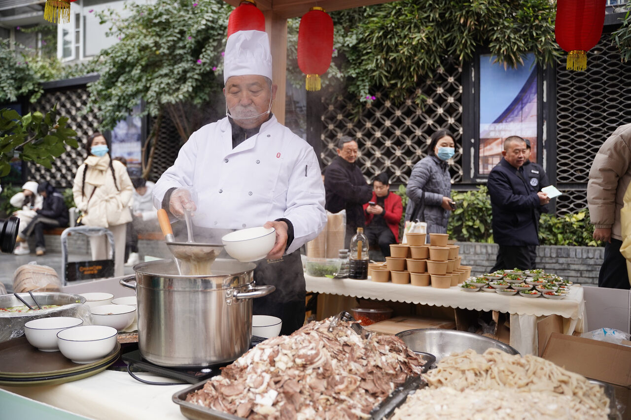 从宽窄巷子东广场步行200余米,走进窄巷子大千小馆,现场熬煮威远羊肉汤并进行售卖,在入口处设置打卡区,在店内设置威远特色产品展示区。