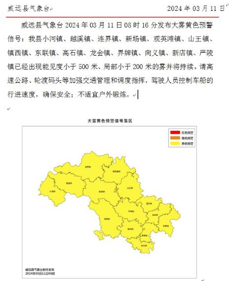 时间:2024-03-11 08:52:35 来源:内江市气象台 四川高速交警3月11日,内江市气象台发布大雾短时临近天气预报,资中县气象台、威远县气象台发布大雾黄色预警信号,内江多个高速站口临时关闭,详情如下。