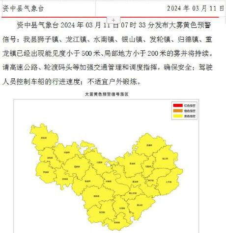 内江市气象台2024年03月11日07时37分发布大雾短时临近天气预报: