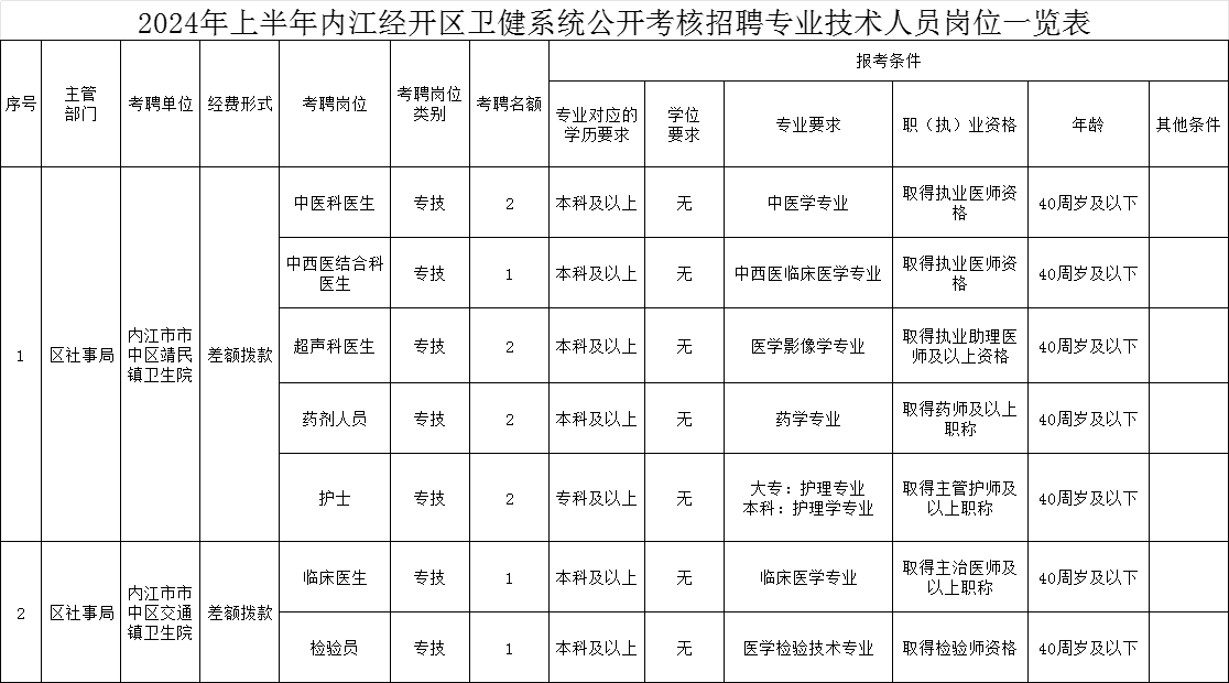 具体考核招聘单位及岗位名额、条件详见附件:《2024年上半年内江经开区卫健系统公开考核招聘专业技术人员岗位一览表》。