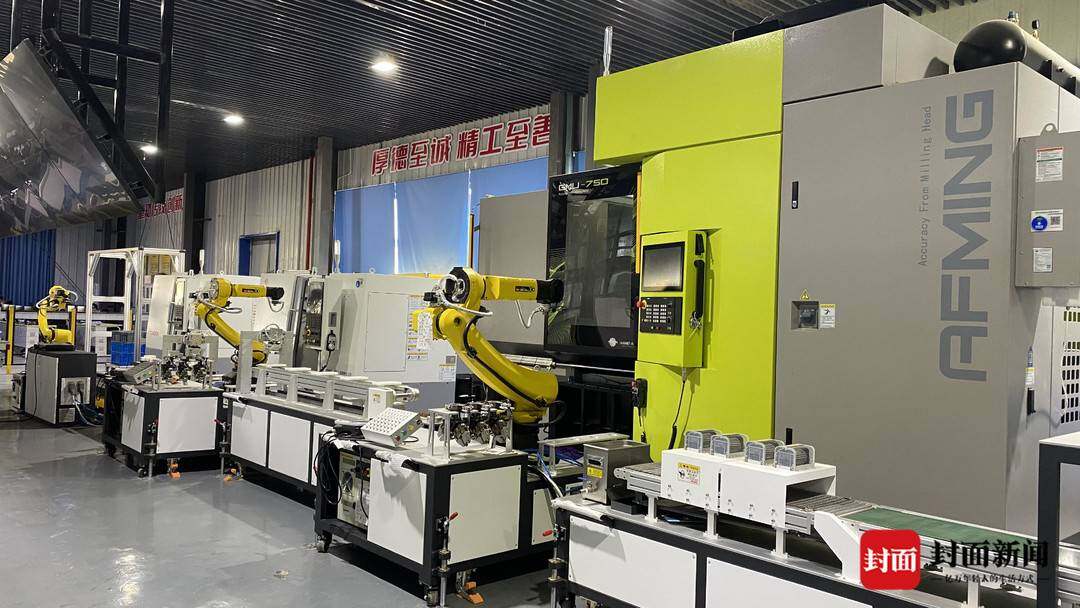 距离他们不远处是柔性智能制造生产车间,3台工业机器人、1台车铣复合机床、1台五轴加工中心有序排列。这些机器可不是摆设,而是真实的生产线——学生可以把自己设计的产品拿到生产线上调试、加工、验证。
