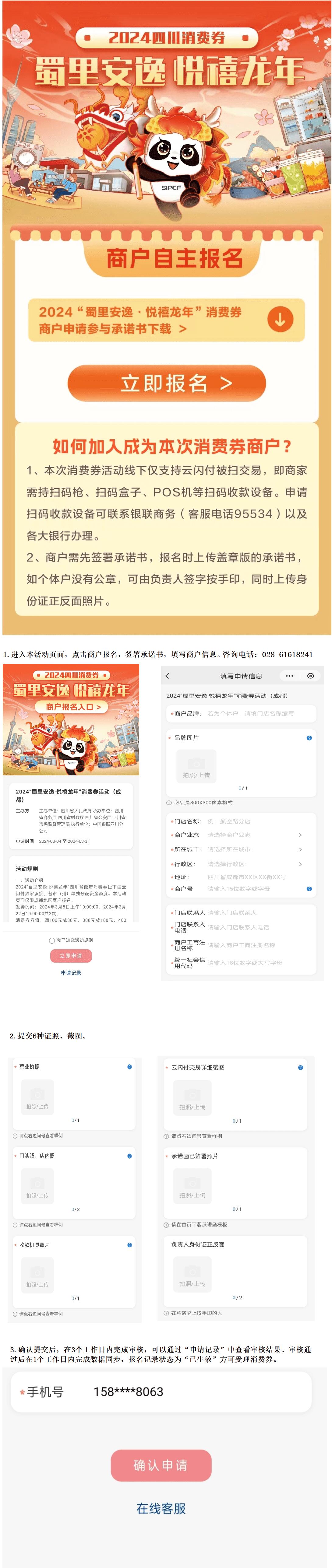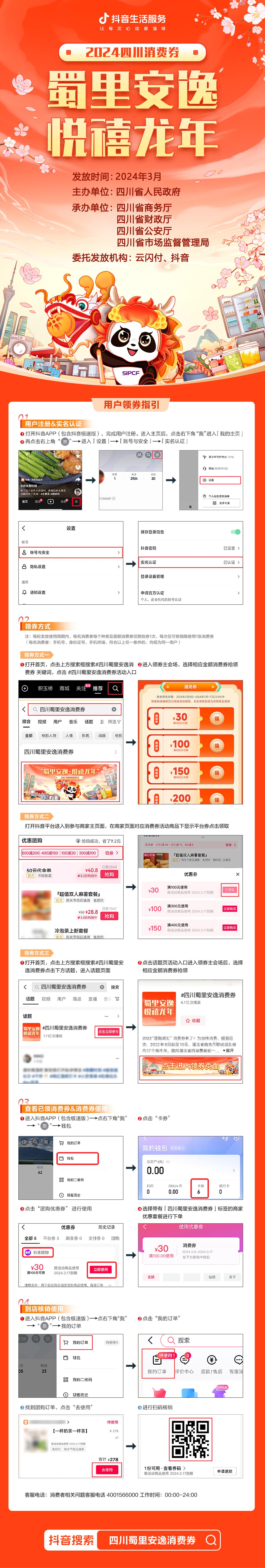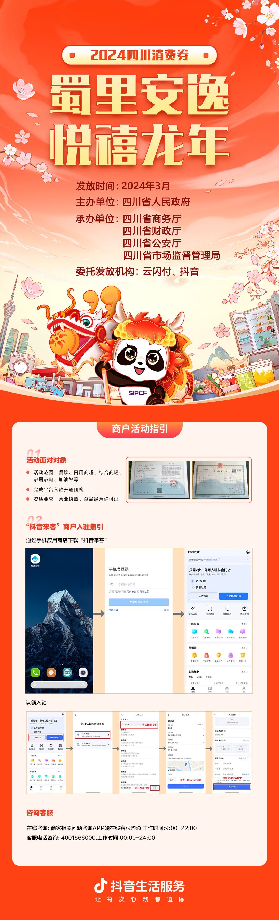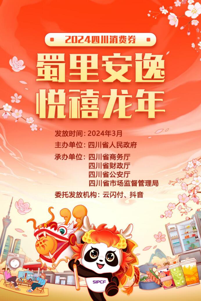 消费者打开云闪付和抖音APP,通过搜索关键词“四川消费券”、平台资源广告位、扫描二维码进入2024“蜀里安逸·悦禧龙年”消费券领取页面,可领取手机定位所在市(州)的消费券。