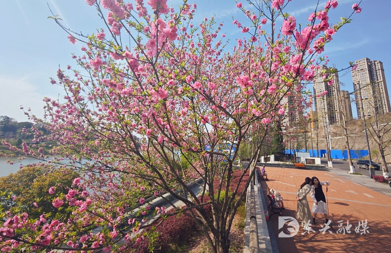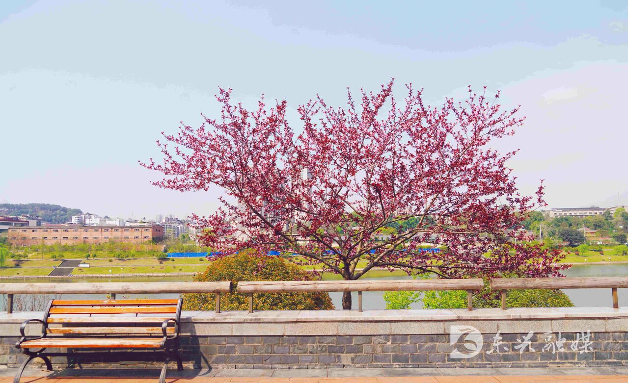“网红树”是一棵碧桃树,碧桃万树天地春, 红云香阵正萦人。枝丫杈间,碧桃花簇拥成串,傲然盛放,红色的妖娆动人,如诗如画,极尽浪漫。