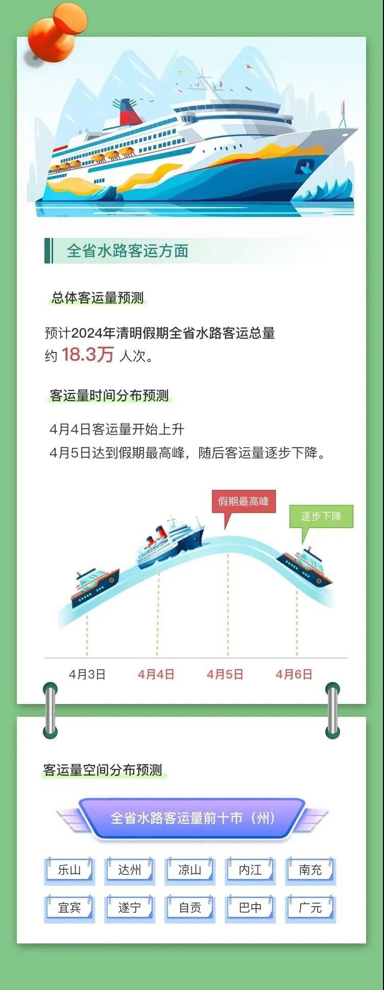 据预测,清明假期高速公路车流量、普通国省干线日均断面流量同比去年增长明显,水路客运量同比去年大幅增长,道路客运量同比去年小幅下滑。