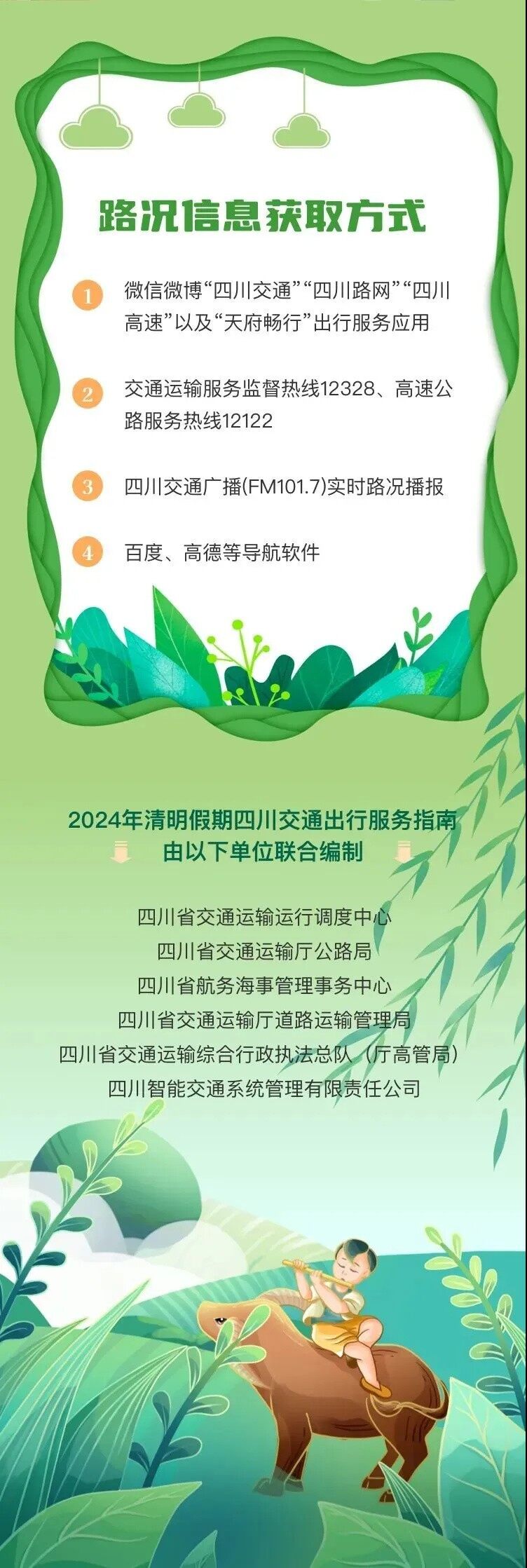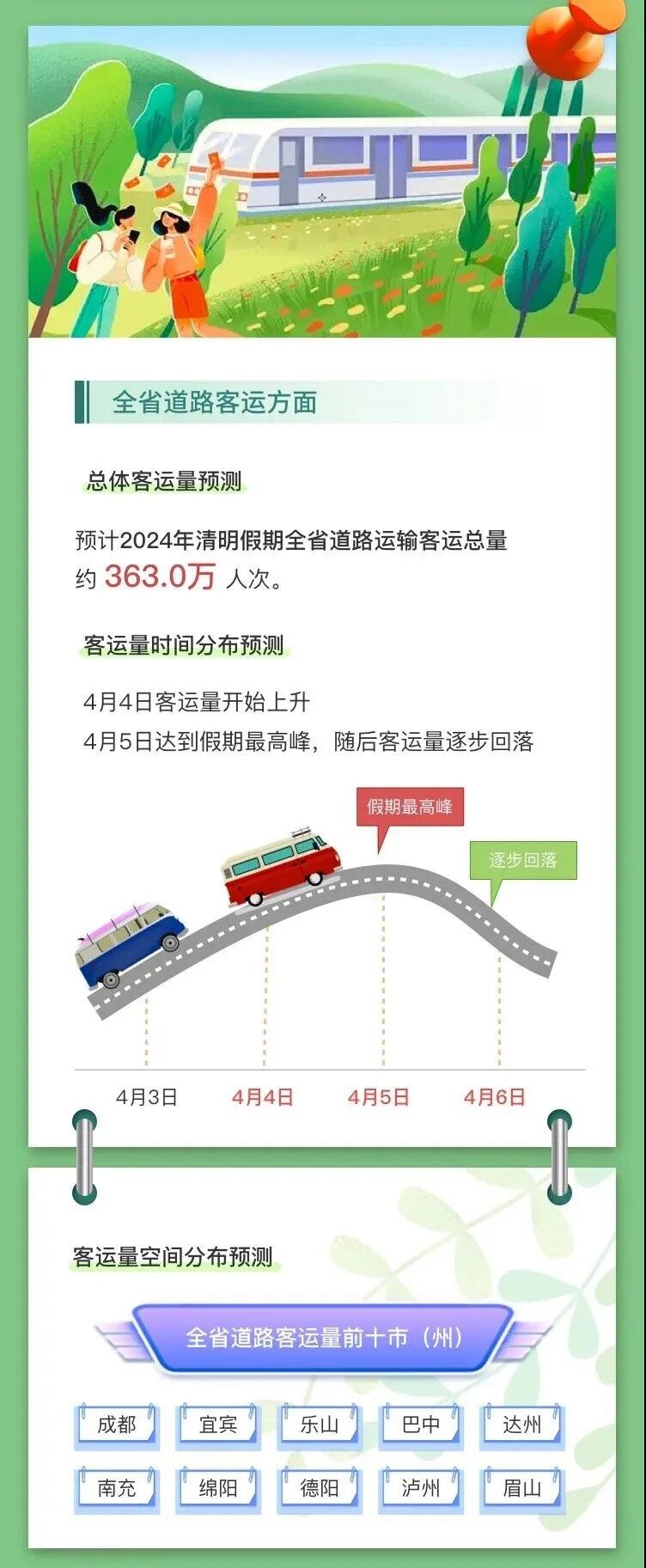 清明假期四川省公路水路交通运输总体综合态势呈现4个特点:一是公众出行热情高涨,同比去年增长明显;二是路网流量首日高峰,公水客运首尾偏低;三是近郊短途出游为主,赏花踏青热度攀升;四是盆地大部阴天为主,假期后段晴间多云。