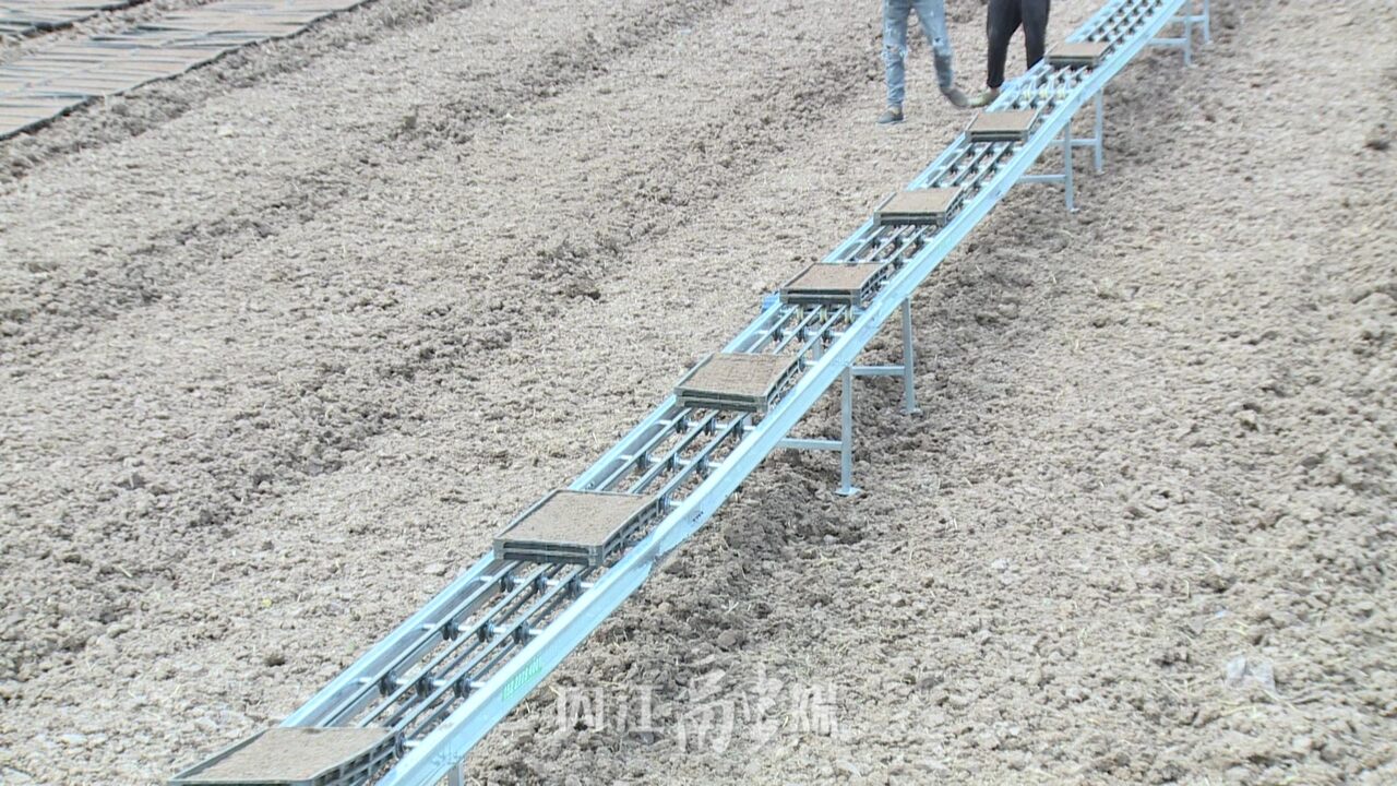 近日,记者在市中区凌家镇彻天寺村四川中农盛禾农业科技有限公司的育秧基地看到,一条自动化的育秧流水线正在作业,秧盘通过自动化育秧设备,完成铺土、撒种、浇水、覆土、出盘等工序后,村民将制作好的秧盘搬运到秧田里,现场一派热火朝天的景象。