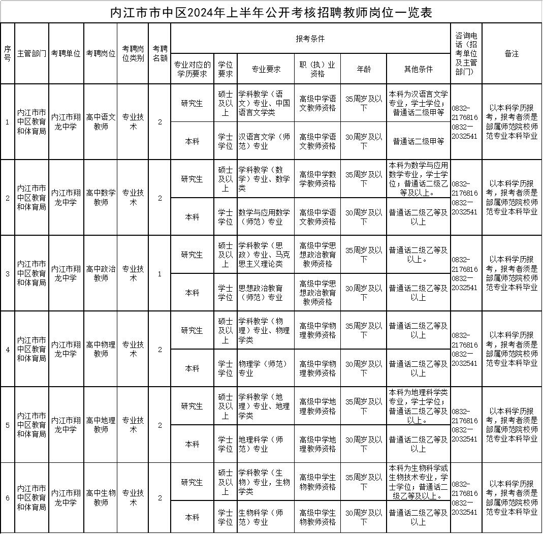 内江市翔龙中学是省级示范高中,属公益一类事业单位。所有招聘岗位都具有事业编制,具体招聘岗位、名额、条件详见《内江市市中区2024年上半年公开考核招聘教师岗位一览表》(附件1)。