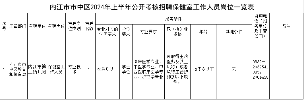 内江市第二幼儿园是省级示范幼儿园,属公益二类事业单位。所招聘岗位具有事业编制,具体招聘岗位名额、条件详见《内江市市中区2024年上半年公开考核招聘保健室工作人员岗位一览表》(附件1)。