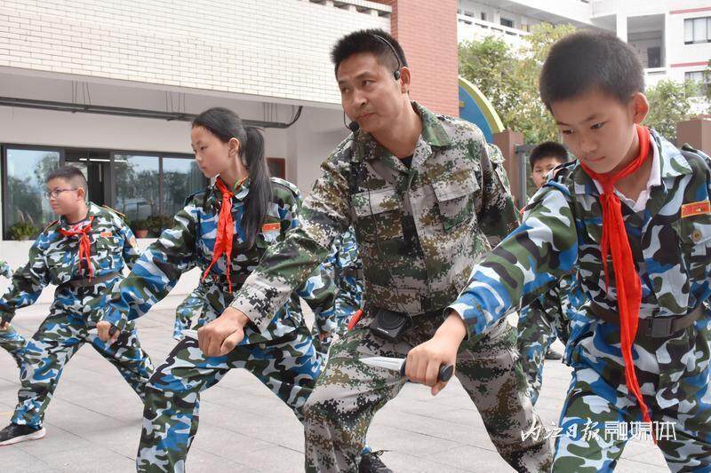 时间:2024-05-17 11:20:02 来源:i 内江退役不褪色。5月9日,退役军人家长冯山国放下手头繁忙的工作,再次穿上迷彩服,走进内江市第十三小学校,教孩子们练习匕首操。