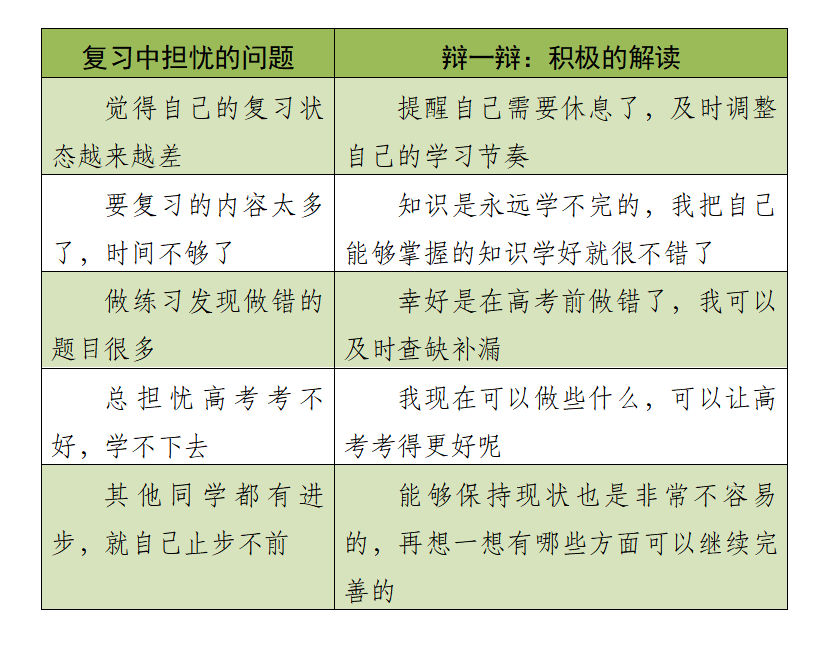 美国心理学家艾利斯提出情绪ABC理论:A表示诱发事件;B表示个体针对此诱发事件产生的一些信念,即对这件事的看法和解释;C表示个体产生的情绪和行为结果。影响我们情绪的并不是发生的事件,而是我们怎么解读这件事。因此我们怎么去解读复习中遇到的困扰、问题,会直接影响到我们的情绪。看到焦虑情绪积极的那一面,把关注的焦点集中在焦虑带来的力量上。