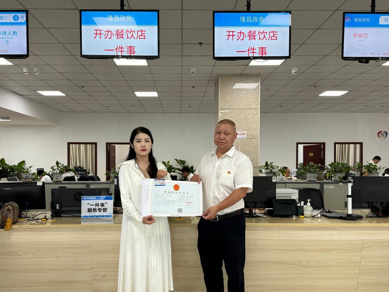 5月27日,谢女士在隆昌市行政审批局“开办餐饮店一件事”窗口成功领取了《食品经营许可证》和从业人员健康证等证照,成为隆昌市首个通过“开办餐饮店一件事”服务高效办结的市场主体。