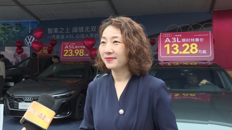 内江蓝池胜龙奥迪总经理李彦告诉记者:“今天胜龙奥迪给大家带来了全新的产品来到我们参展的现场,A5是我们今年全新上市的一款车型,这款车的话239800元起,并且它现在预定还有一个权益的礼包。希望把这样的福利带给我们内江的父老乡亲,大家能在车展现场选到心仪的车型。”