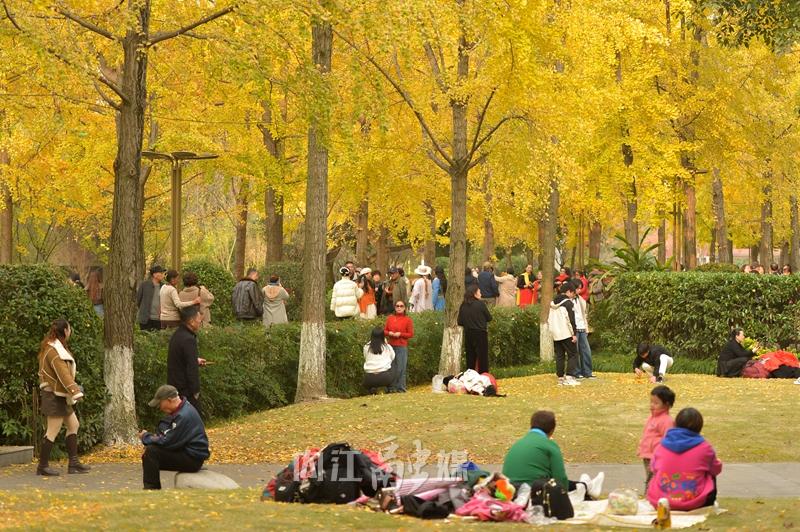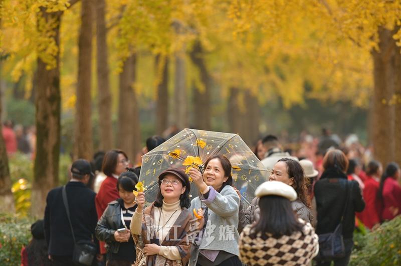暖阳下,市民或缓步穿行于银杏林间,沉浸式感受初冬的浪漫;或与家人朋友并肩驻足,以金黄的银杏为背景拍照留念;亦有游人闲坐树下,晒着太阳聊着天,尽情享受这份独属于冬日的惬意。