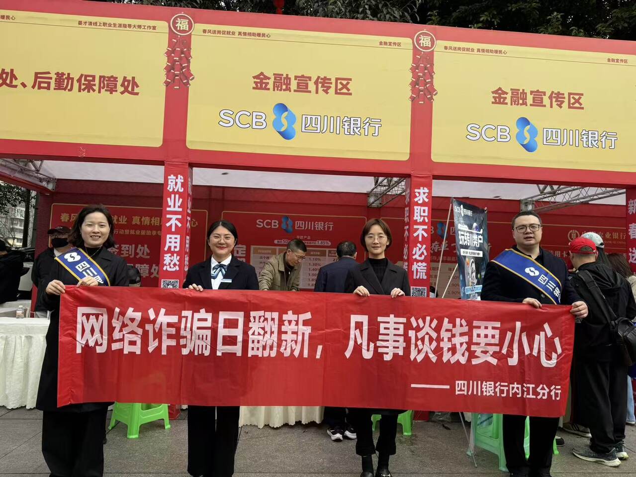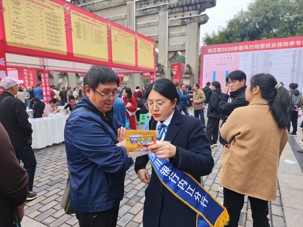 本次 “春风行动” 吸引了大量求职者和用工单位参与。四川银行内江分行抓住这一契机,在活动现场设置专门的金融宣传区,通过悬挂宣传横幅、发放宣传折页、一对一讲解等多种形式,重点围绕防范电信网络诈骗、一次性信用修复政策、银行卡安全使用、存款保险知识等内容开展宣教。