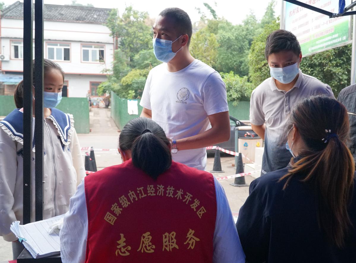 记者先后前往靖民镇卫生院、靖民镇凉风社区、内江经开区高速路口、英伦世家小区、甜城印象小区等核酸采集点看到,各镇街、单位、部门党员干部全部下沉到一线,与广大志愿者们一起,积极协助社区工作人员及医务人员开展工作,各点位核酸采集有序进行。