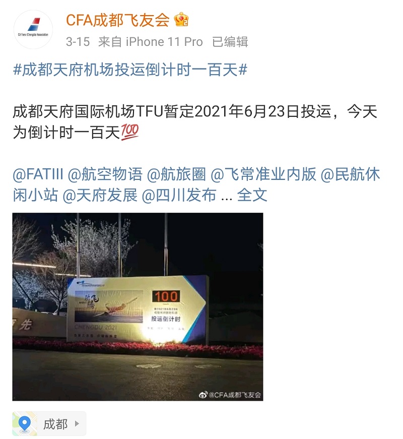 3月15日,微博“CFA成都飞友会”发布了一张内容为“成都天府国际机场投运倒计时牌”的照片。