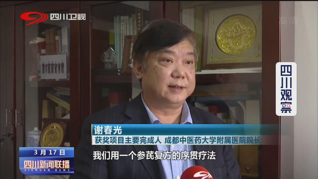 项目主要完成人 成都中医药大学附属医院院长 谢春光:我们研发了16个医院制剂,用于治疗糖尿病慢性并发症取得了非常好的效果。我们用一个参芪复方的序贯疗法,在治疗糖尿病大血管方面,改善症状的有效率能达到90%多。