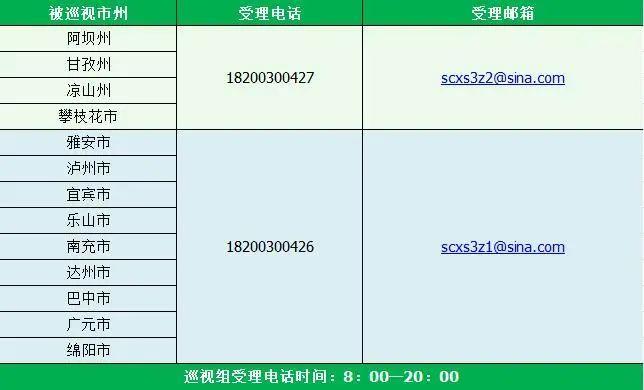 记者了解到,巡视组在巡视期间(进驻之日至2021年5月15日)将设专门值班电话和专门邮政信箱,开通电子邮箱和信访意见箱等信访渠道,主要受理森林草原防灭火工作有关问题反映。其中,阿坝州、甘孜州、凉山州、攀枝花市巡视专门值班电话:18200300427,电子邮箱:scxs3z2@sina.com;雅安市、泸州市、宜宾市、乐山市、南充市、达州市、巴中市、广元市、绵阳市巡视专门值班电话:18200300426,电子邮箱:scxs3z1@sina.com。巡视组受理电话时间:8:00—20:00。