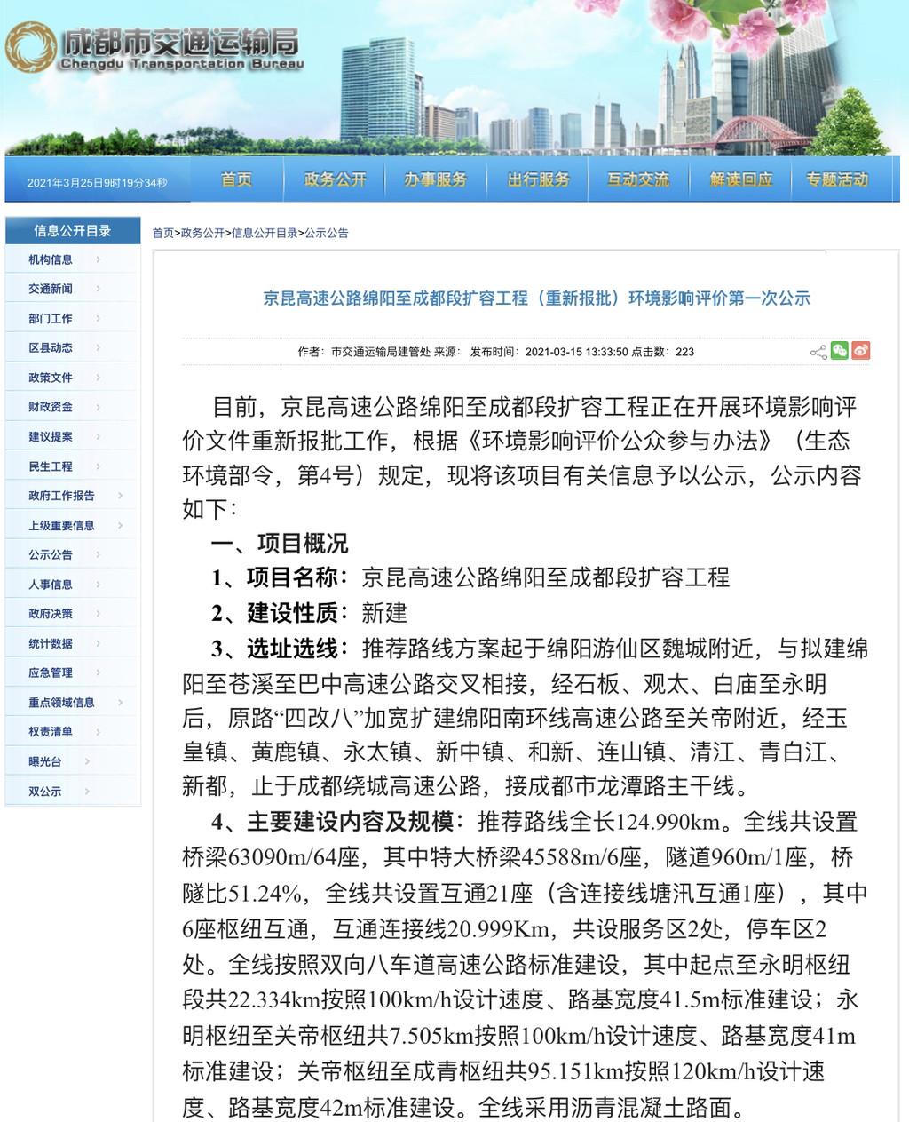 3月25日,记者从成都市交通运输局获悉,目前,京昆高速公路绵阳至成都段扩容工程(重新报批)进行环境影响评价第一次公示。此前,G76(G85)成都至重庆(四川境)高速公路扩容工程也进行了环境影响评价第一次公示。
