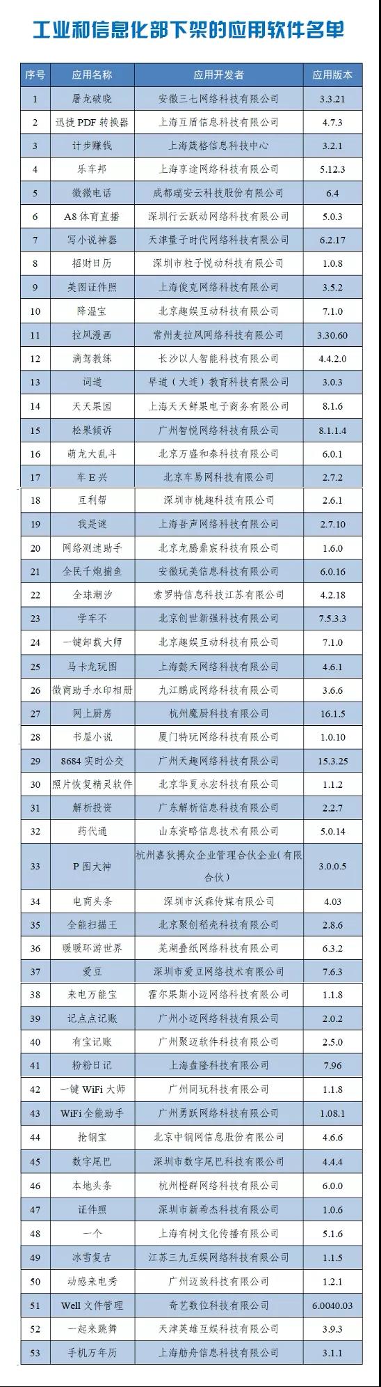 工信部4月6日发布“关于下架侵害用户权益App名单的通报”。通报称,在2021年3月11日,工信部向社会通报了136家存在侵害用户权益行为App企业的名单。截至目前,经第三方检测机构核查复检,尚有53款App未按照要求完成整改。
