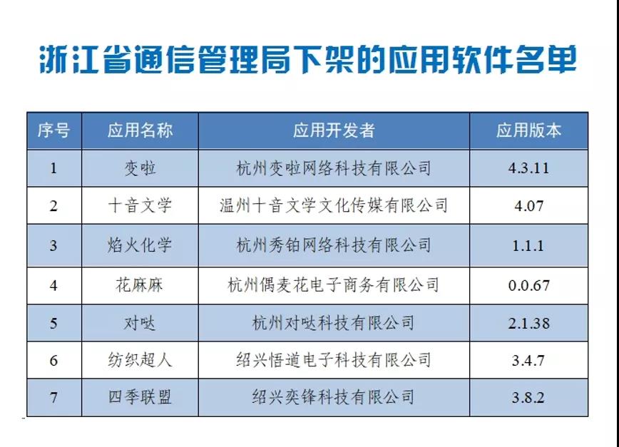 此外,各地通信管理局按工信部App整治行动部署,积极开展手机应用软件监督检查,此次浙江省通信管理局检查发现仍有7款App未完成整改。