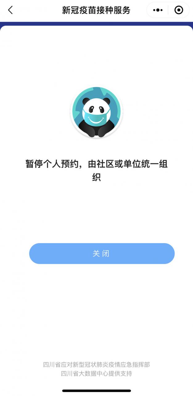 时间:2021-04-13 22:05:17 来源:川观新闻4月13日,有市民反映打开四川天府健康通小程序,欲进行新冠疫苗接种预约,结果显示“暂停个人预约,由社区或单位统一组织”。