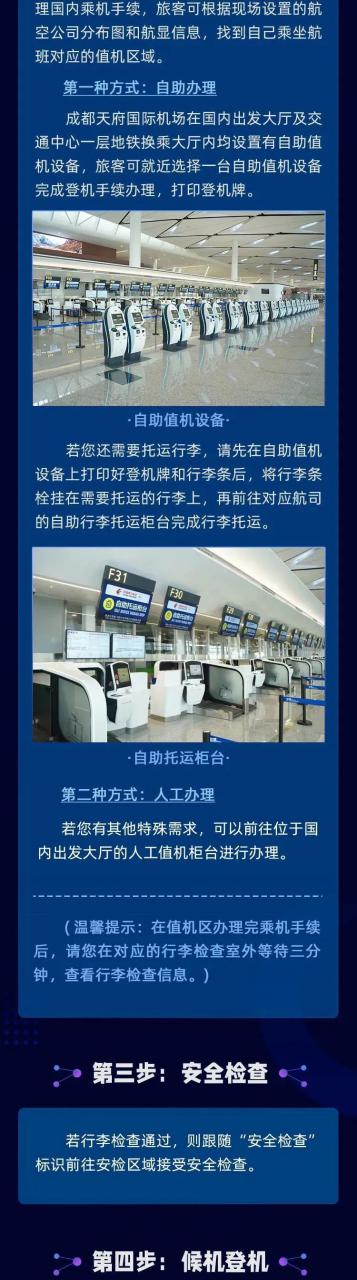 第四步:没有托运行李的旅客,带上登机牌和随身证件即可前往安检区域。有托运行李的旅客,还需点击“托运行李”选项,确定行李的数量后,点击“托运行李“选项即可取得行李条,将行李条拴挂在行李上,带上登机牌和随身证件前往对应航司的自助托运柜台,按照提示完成行李托运。