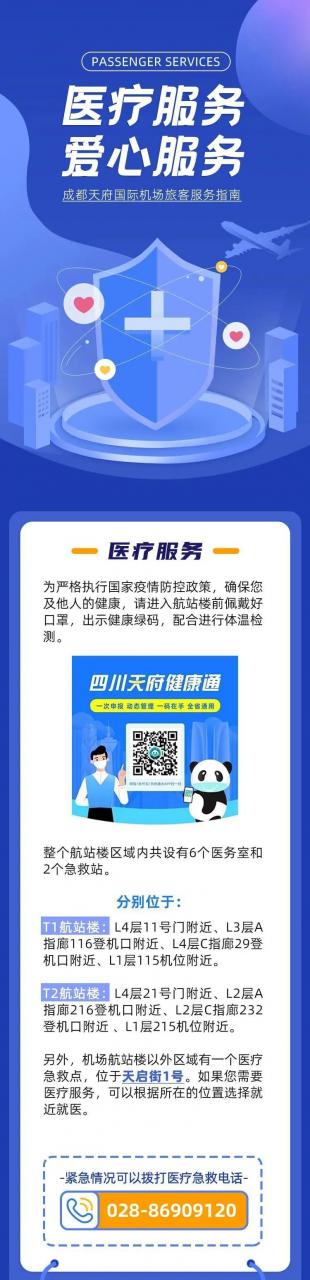 若在机场需要寻求医疗服务,旅客紧急情况下可以拨打医疗急救电话:028-86909120,同时机场的T1、T2两个航站楼区域内还设有6个医务室和2个急救站,并在航站楼外区域的天启街1号设有一个医疗急救站。