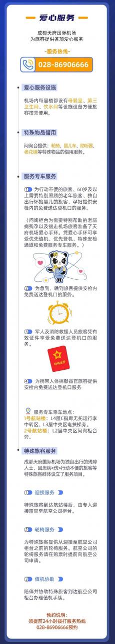 天府机场为旅客提供各项爱心服务,机场内每层楼都设有母婴室、第三卫生间、饮水间等设施设备,同时在问询台可以为旅客提供轮椅、婴儿车、助听器、老花镜等特殊用品的借用服务。