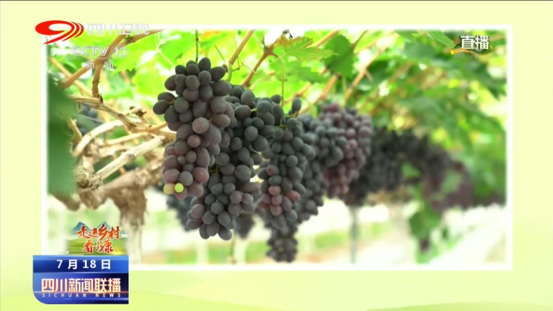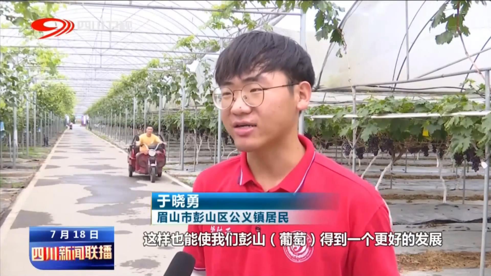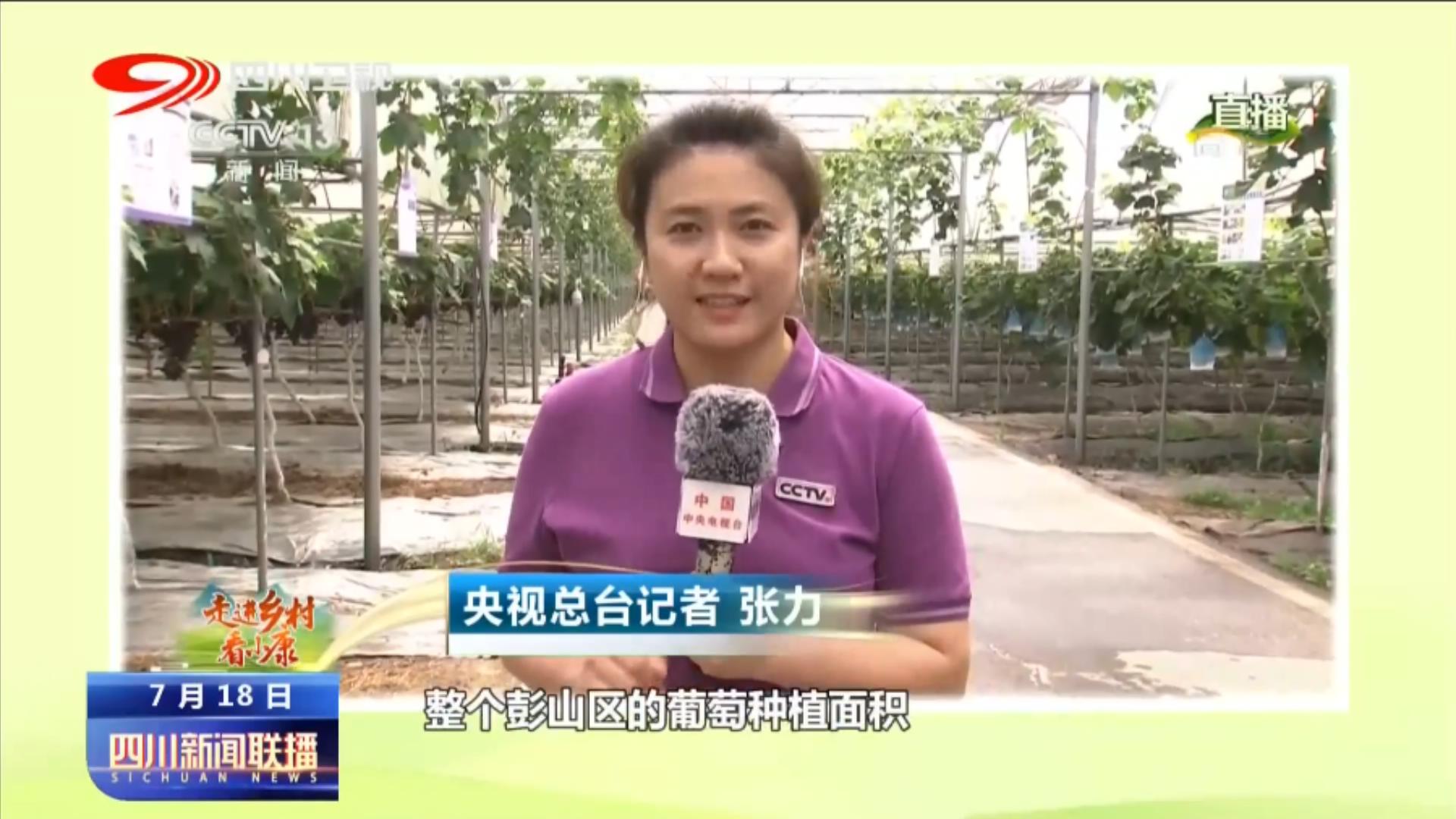 央视总台记者 张力:我现在所在的位置就是在彭山区公义镇,整个彭山区的葡萄种植面积已经超过了三万亩,品种有48个,根据成熟的时节不同,它采摘的时间可以从当年的六月底一直持续到九月初 。