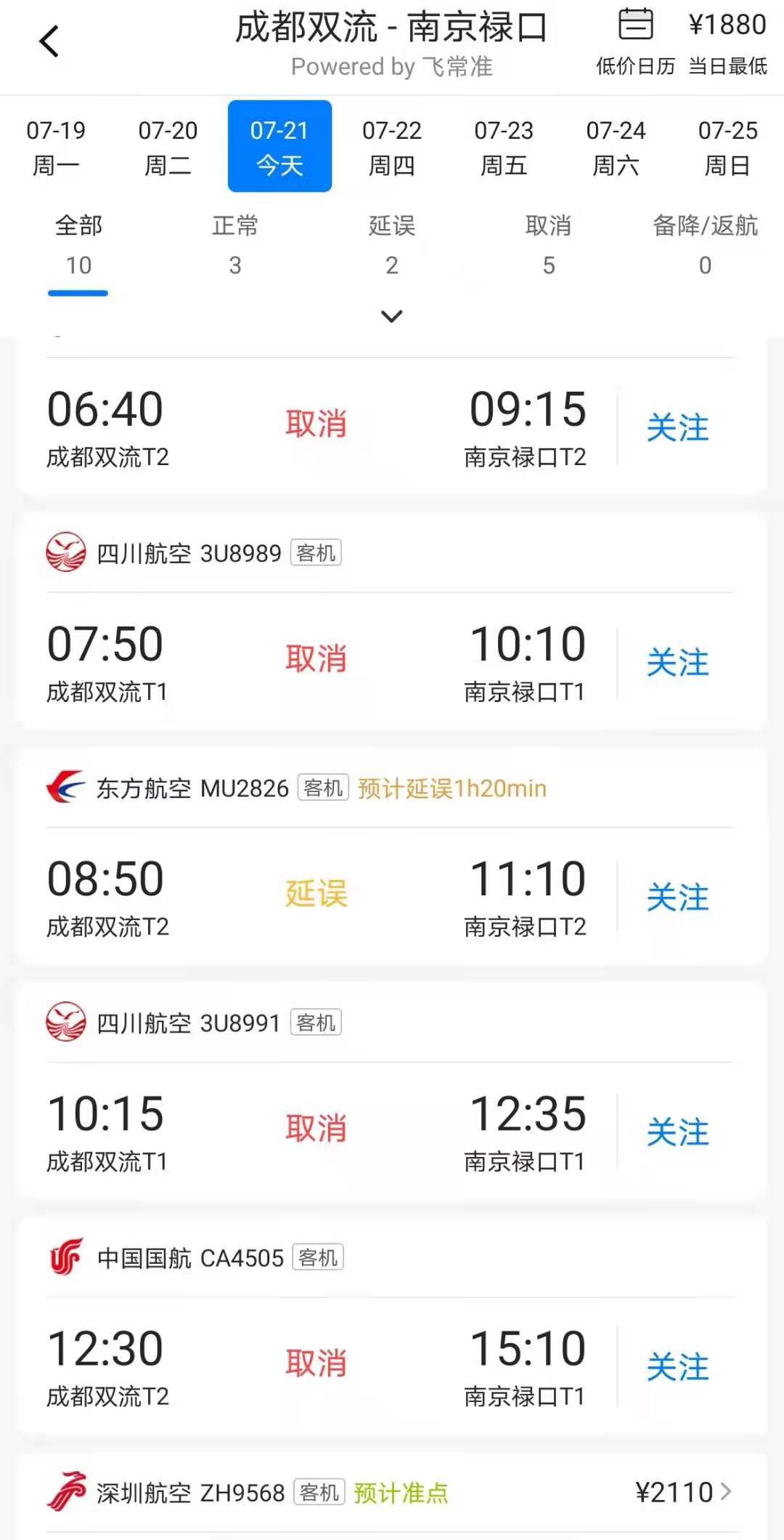 7月21日上午,记者通过查阅飞常准等航旅软件看到,受河南暴雨及南京禄口国际机场人员定期核酸检测出现阳性报告的影响,今天四川多个城市飞往郑州和南京的航班被取消。