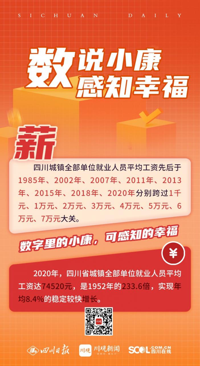 随着四川经济的持续快速增长,居民收入得到保障、工资水平持续提升、生活水平得到显著提高。2020年,四川省城镇全部单位就业人员平均工资达74520元,是1952年的233.6倍,实现年均8.4%的稳定较快增长。