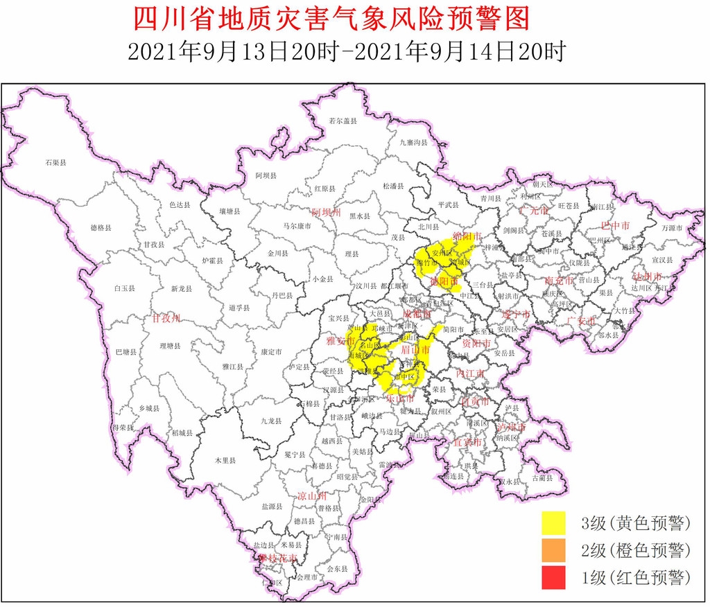 时间:2021-09-14 15:39:16 来源:四川在线9月13日,省地灾指挥部办公室发布全省地灾气象风险黄色预警。根据四川省地质环境条件,结合四川省气象台天气预报情况,9月13日20时至9月14日20时,6市33个县(市、区)进入黄色预警范围。