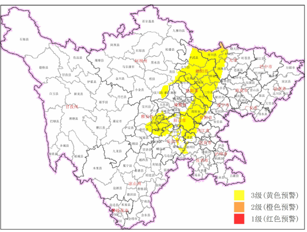 3级,黄色预警区域为广元利州区、朝天区、昭化区、青川县、剑阁县,绵阳安州区、涪城区、游仙区、江油市、平武县、盐亭县、三台县、梓潼县、北川县,德阳罗江区、旌阳区、什邡市、广汉市、绵竹市、中江县,成都龙泉驿区、青白江区、双流区、邛崃市、简阳市、金堂县、蒲江县,资阳雁江区、乐至县,内江威远县、资中县,自贡荣县,宜宾叙州区,雅安名山区、雨城区、荥经县、天全县、芦山县,眉山东坡区、彭山区、青神县、仁寿县、洪雅县、丹棱县,乐山市中区、五通桥区、沙湾区、峨眉山市、犍为县、井研县、夹江县、沐川县,阿坝州汶川县、茂县等12市(州)54个县(市、区)。