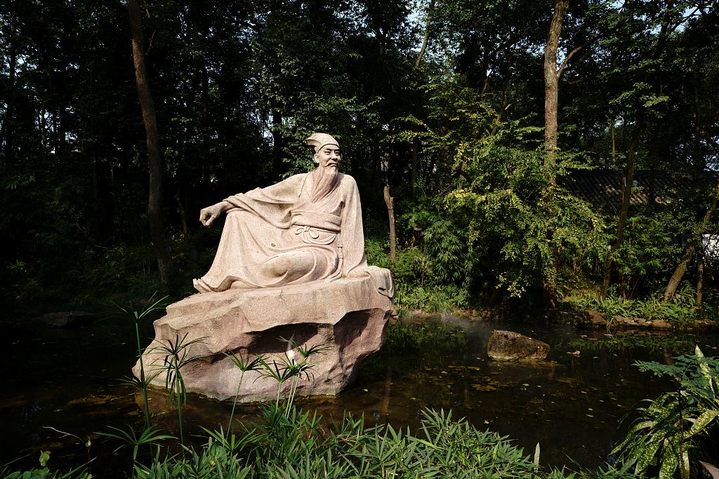 △三苏祠中,苏轼石雕坐像立于水塘之边。(图/视觉中国)