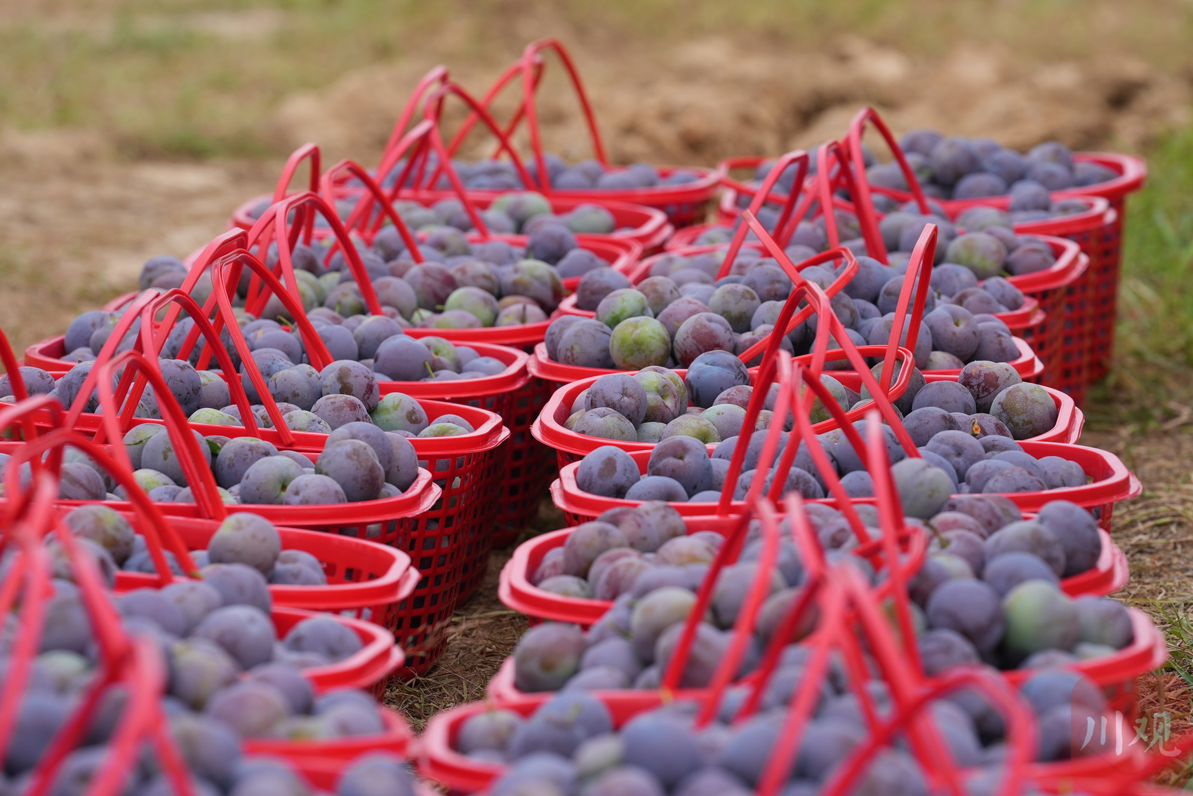 来自重庆渝北的何跃宽,2018年来到川渝高竹新区成立了耀宽种植专业合作社,主要发展李子产业,供川渝游客采摘 。这是采摘下来的新鲜李子。