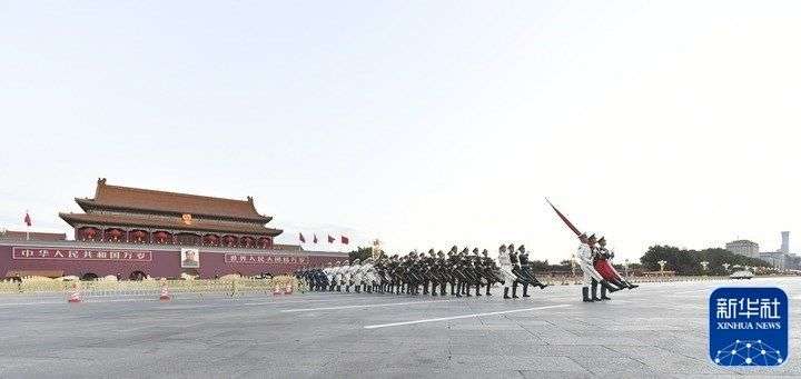 10月16日清晨,北京天安门广场举行升国旗仪式。10月16日,中国共产党第二十次全国代表大会即将在北京人民大会堂开幕。新华社发(韩晓振 摄)