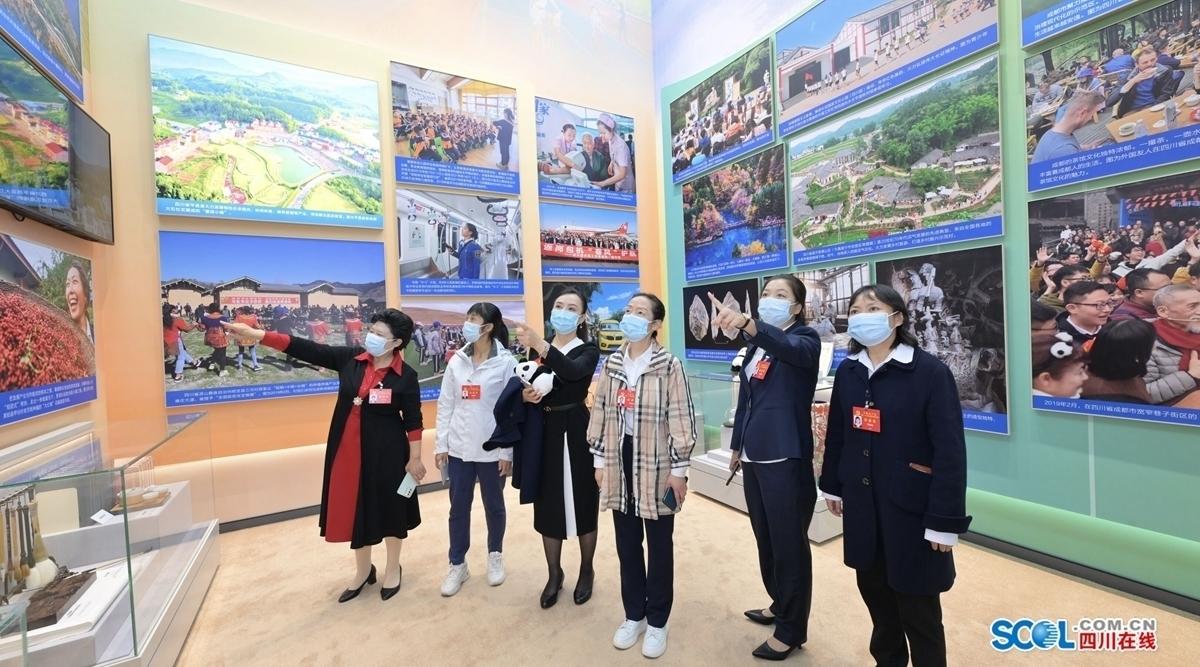 王晓晖、黄强等代表沿着展览参观线路走进相应展区,认真听取讲解、观看展示。一件件实物模型、一段段生动视频、一幅幅亮眼图片、一个个感人故事,让四川省代表团代表们真切感受到新时代党和国家事业取得的重大成就,深刻领会到新时代党和国家事业之所以能够取得历史性成就、发生历史性变革,根本在于习近平总书记掌舵领航,在于习近平新时代中国特色社会主义思想科学指引。在成渝地区双城经济圈沙盘、金沙江上的梯级巨型水电站模型、三星堆遗址出土的青铜人头像、巨型直升机飞往凉山州布拖县拉果乡阿布洛哈村场景图片等具有四川元素的展示点位,代表们驻足观看,为在以习近平同志为核心的党中央坚强领导下新时代治蜀兴川各项事业取得的巨大成就,深感自豪、倍感振奋。
