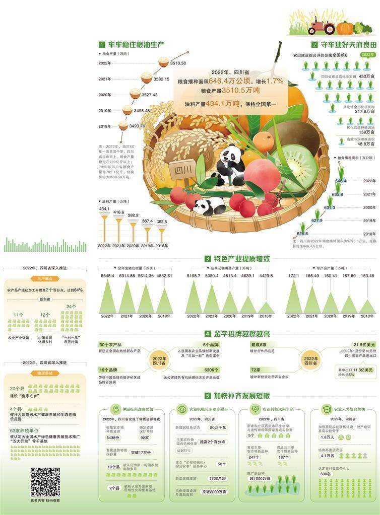 今年中央一号文件提出,建设供给保障强、科技装备强、经营体系强、产业韧性强、竞争能力强的农业强国。由农业大省向农业强省跨越,上述“五强”在四川已露端倪。供给保障方面,2022年粮食产量702.1亿斤,实现大灾之年保丰收,油菜籽产量和生猪出栏量继续保持全国第一;科技装备方面,农业科技创新步伐加快,设施装备应用不断落地,“兴农于技”向更广领域发展;经营体系方面,培育了大量高素质农民和新型农业经营主体;产业韧性方面,乡村休闲旅游业、农产品加工业等风生水起,新产业新业态新模式蓬勃发展;竞争能力方面,川粮油、川畜牧、川果川茶、川菜川酒、川竹川药享誉全国。