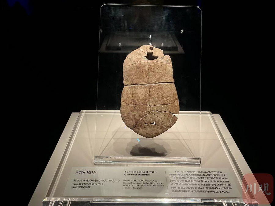 谁发明了汉字?关于汉字的起源,结绳说、八卦说、刻契说、仓颉造字说等说法历来众说纷纭。走进特展序厅,一件8000余年前的贾湖刻符龟甲,从文物的角度为我们理解汉字起源提供了实物资料。展览执行策展人魏敏介绍,龟甲下部有一刻画符号,像是一只正在向下看的眼睛,与后来甲骨文、金文中“目”字的写法相似,“贾湖遗址共发现刻画符号17例,研究者推测这些符号的使用可能与原始巫术有关,这也是目前所知最早的汉字源头。”