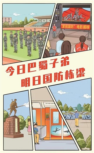 通过“图鉴”可以看到:校园里,五星红旗伴着巴蜀子弟笔直的军姿飘扬,课堂上讲述着抗战历史故事;社区广场上,“爱我国防”电影常态化展映;成都市人民公园内,本土抗战英雄的纪念碑、主题雕塑等吸引市民游客参观打卡;穿梭城市的地铁上,车厢满是国防主题元素;成飞公园里,巴蜀子弟的航空梦想在战机模型旁悄然萌芽……
