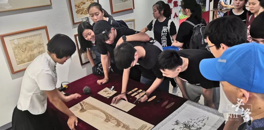 随后,交流团一行前往永安镇尚腾新村,参观了魔豆工坊和汉安烙画,并现场体验扎染技艺,感受“非遗”魅力。