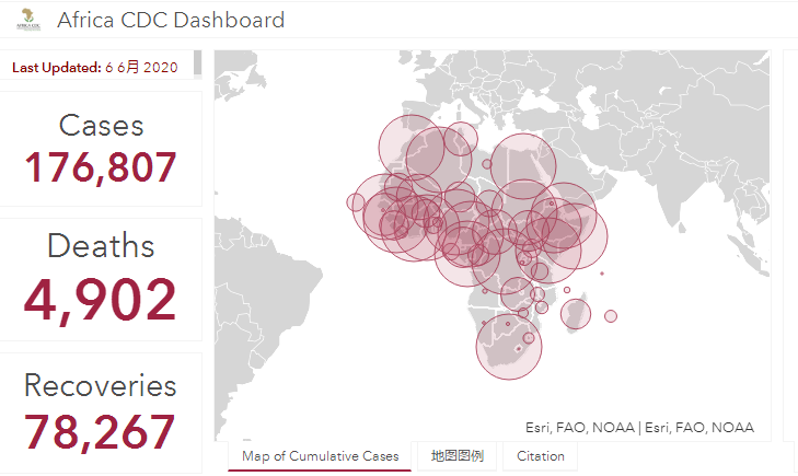 截至非洲东部时间6月6日下午14时,非洲疾控中心数据显示:非洲地区54个国家报告了新冠肺炎确诊病例176807例,死亡4902例,78267人康复。