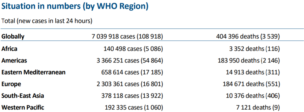 根据世卫组织最新实时统计数据,截至欧洲中部夏令时间6月8日16时(北京时间6月8日22时),全球确诊新冠肺炎7039918例,死亡404396例。