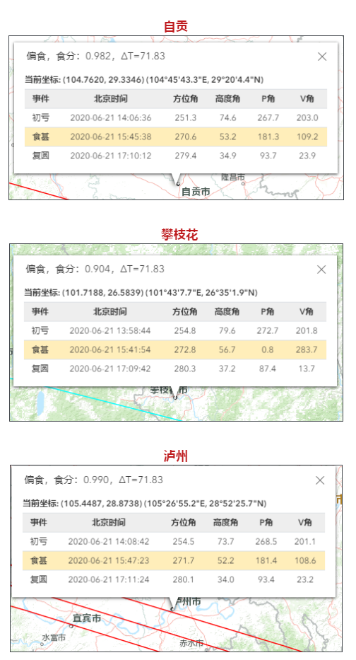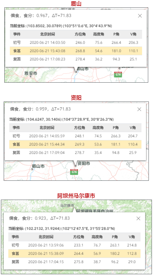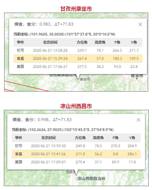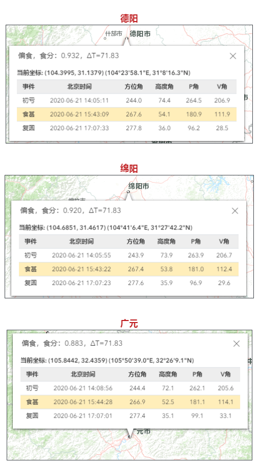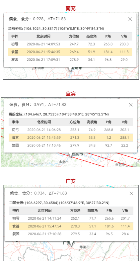 以成都地区为例,初亏到复圆时间为6月21日14:04:20-17:07:58,食甚在15:43:04。