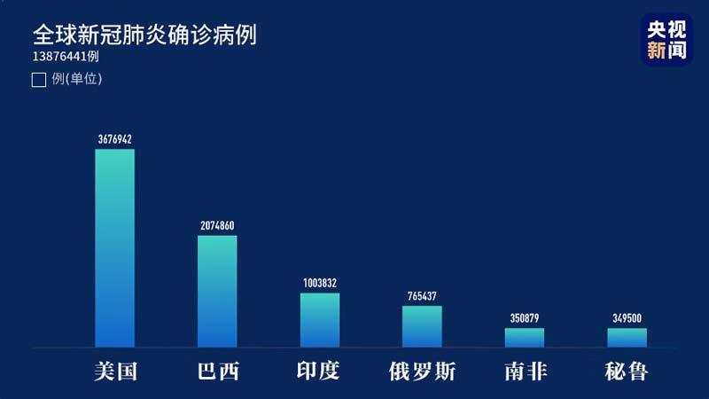截至欧洲中部夏令时间7月18日17时01分(北京时间7月18日23时01分),全球累计新冠肺炎确诊病例13876441例,累计死亡病例593087例。世卫组织最新一期新冠肺炎每日疫情报告显示,全球新冠肺炎新增259848例,死亡新增7360例。