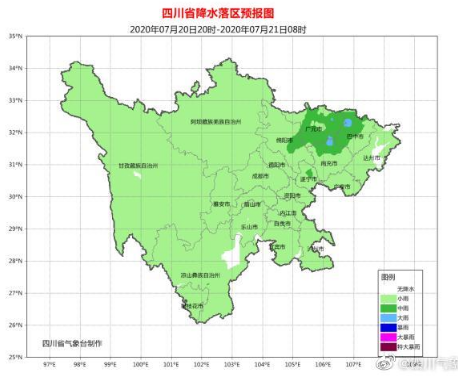 今天(7月20日)晚上,盆地各市阴天有阵雨或雷雨,其中广元、绵阳、南充、巴中4市有中雨,局部地方有大雨;川西高原和攀西地区阴天间多云有分散阵雨或雷雨。