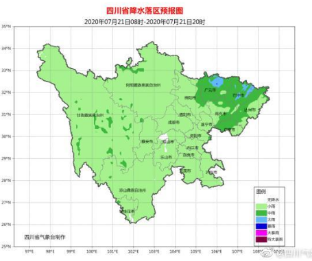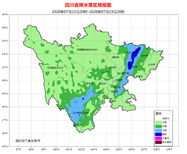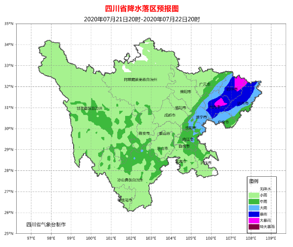 7月21日晚上到22日白天,盆地各市阴天有阵雨或雷雨,其中巴中、达州、广安、南充、遂宁、资阳6市和广元市东部有大雨到暴雨,局部地方有大暴雨;川西高原大部阴天间多云有阵雨或雷雨,局部地方有中雨,攀西地区阴天有小雨,凉山州北部有中雨。