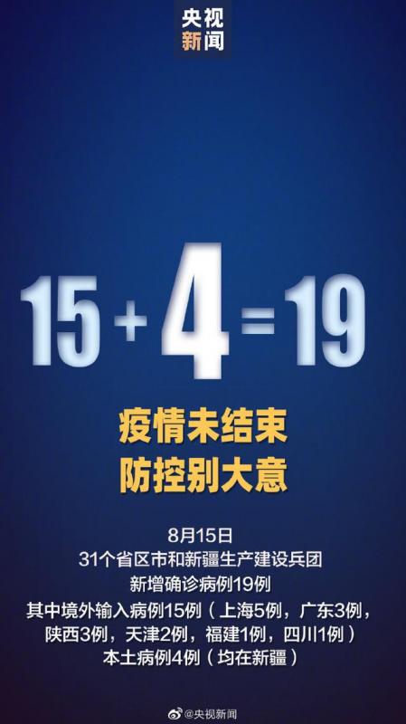 8月15日0—24时,31个省(自治区、直辖市)和新疆生产建设兵团报告新增确诊病例19例,其中境外输入病例15例(上海5例,广东3例,陕西3例,天津2例,福建1例,四川1例),本土病例4例(均在新疆);无新增死亡病例;新增疑似病例1例,为境外输入病例(在福建)。