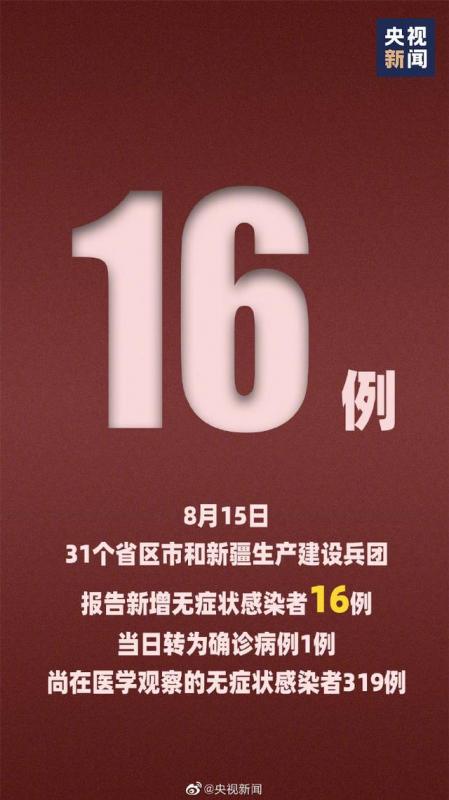 31个省(自治区、直辖市)和新疆生产建设兵团报告新增无症状感染者16例(境外输入11例);当日转为确诊病例1例(为境外输入);当日解除医学观察14例(境外输入9例);尚在医学观察无症状感染者319例(境外输入176例)。
